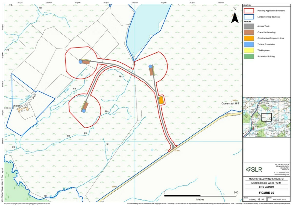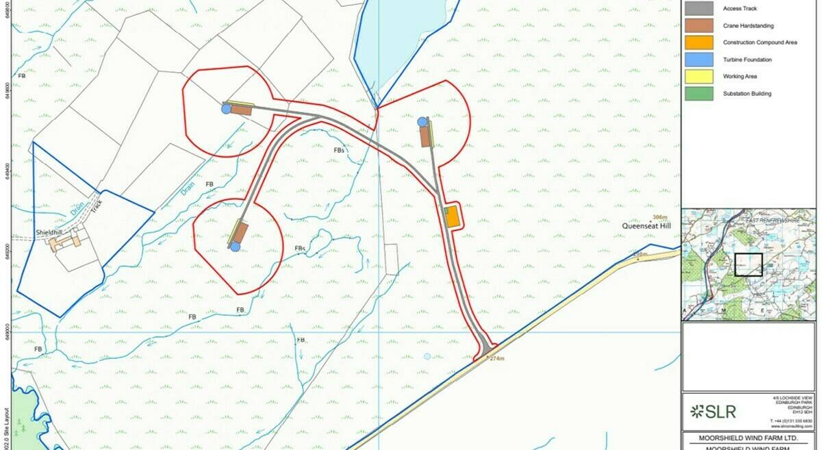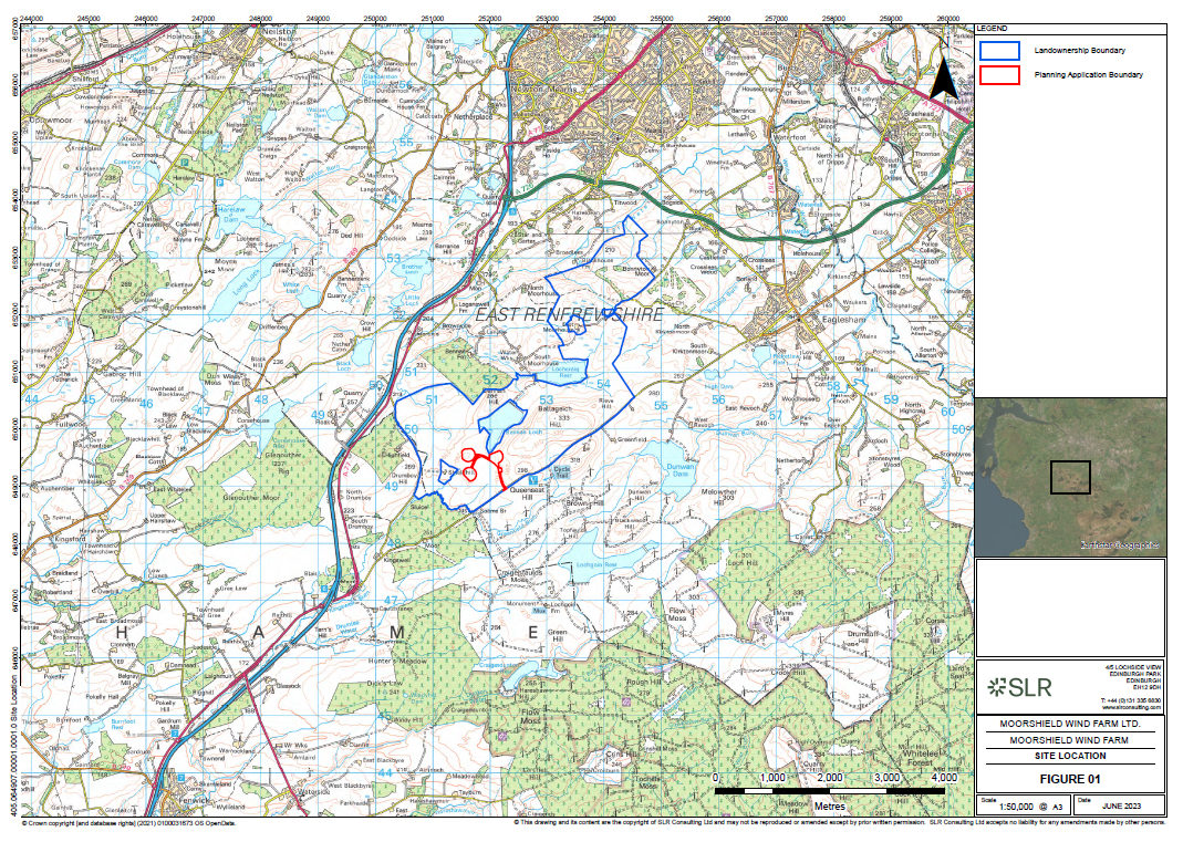 A revised planning application for Moorshield Wind Farm was submitted to East Renfrewshire Council and validated on 14/09/2023, with planning reference 2023/0542/TP which was granted on 25/09/2024.
